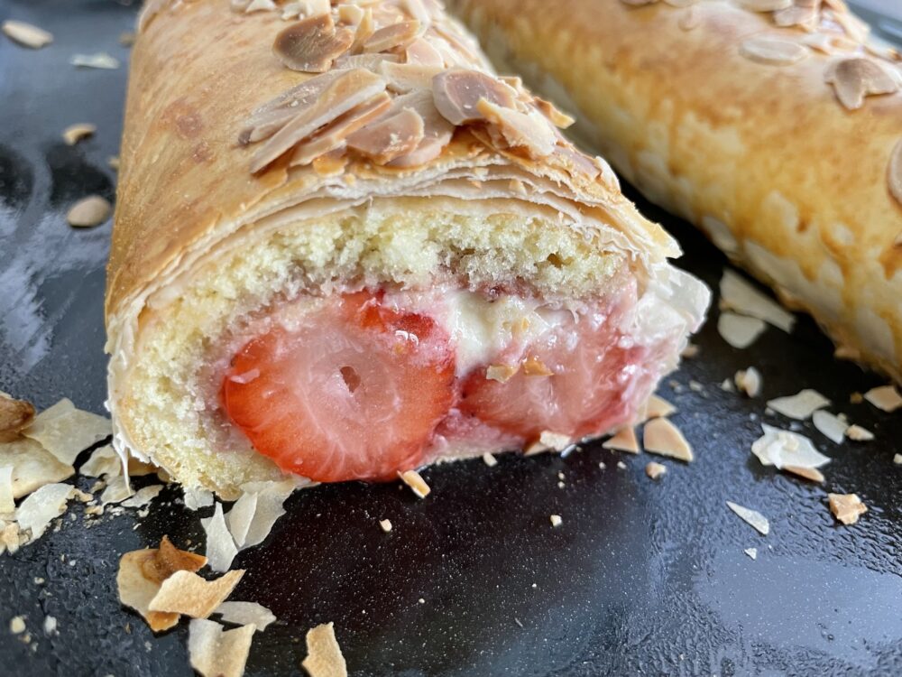 dünnes Mohnbisquit gefüllt mit Schokolade-Obers-Creme