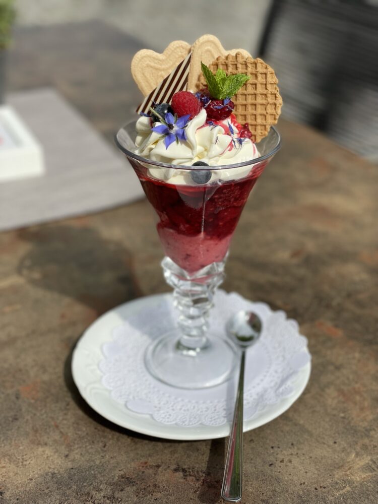 3 Kugeln cremiges Vanilleeis mit hausgemachter, mild herber Preiselbeermarmelade, als fruchtiger Touch. Ein bisschen Schlagobers und Schokolade-Flocken und gehacktem Nusskrokant.