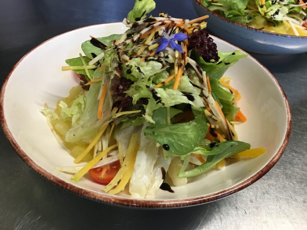 gibts in 3 Größen: zum Menü vergünstigt als Blatt- oder gemischter Salat Beilagensalat große Salatplatte: verschiedene GEmüse- und Blattsalate, selbstgemacht mit pikanter Dressing und Kräutern