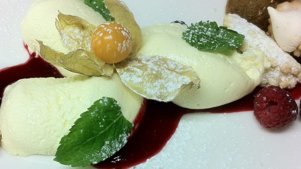 Joghurteis, Beerenragout, ganz viel hausgemachte Schokoladesoße, bisschen Schlagobers
