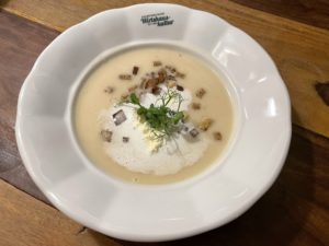 Knoblauchcremesuppe / Obershauberl / Schwarzbrotwürferl