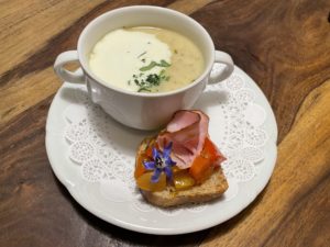 Schinken-Lauch-Cremesuppe / geröstete Weißbrotwürferl